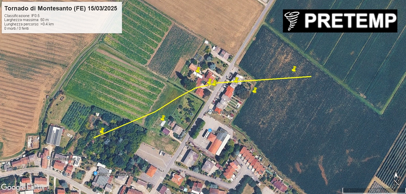 - Descrizione : Lievi danni a tetti, un albero caduto, detriti sparsi nei campi // Light roof damage, one fallen tree, debris dispersed in fields