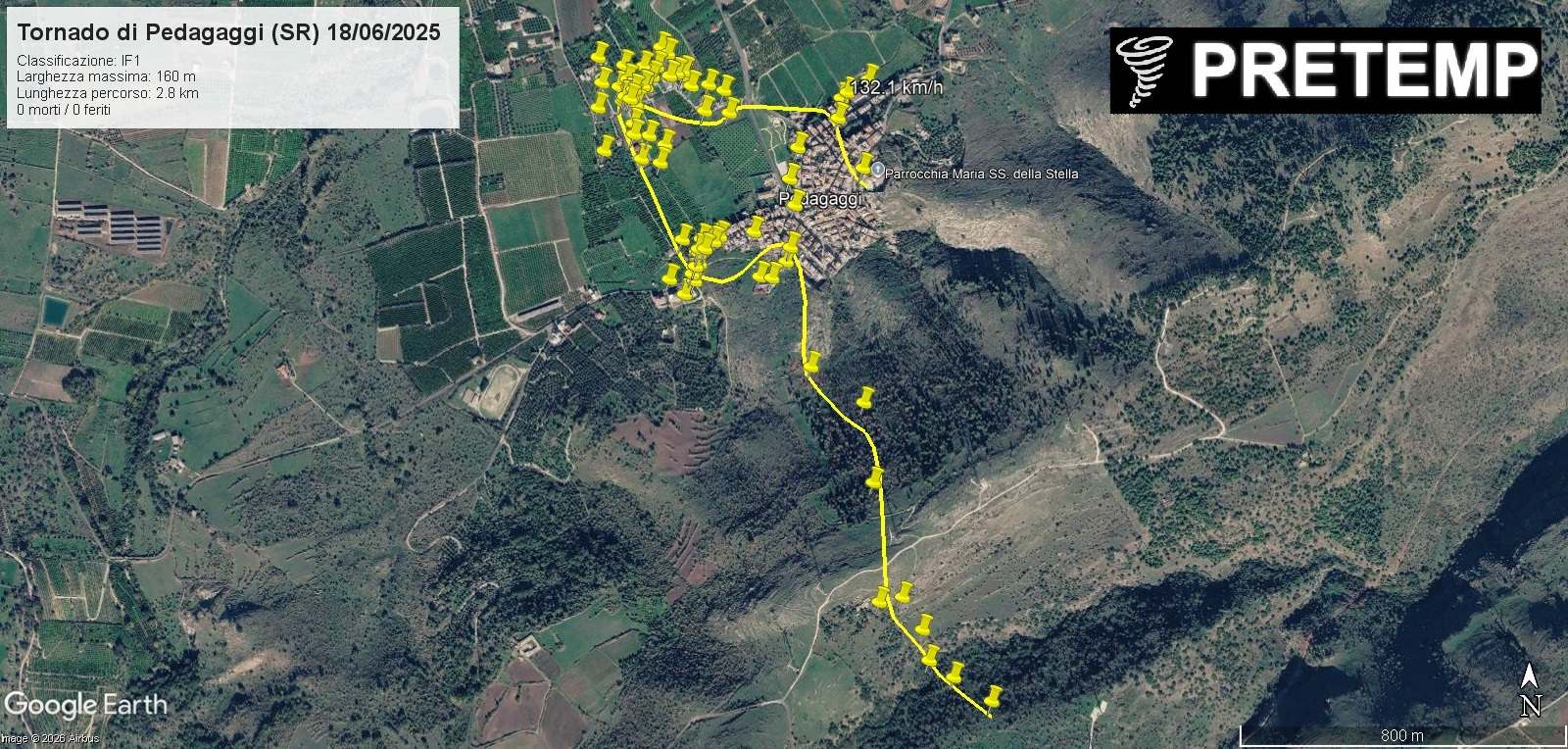 Descrizione : Tetti seriamente danneggiati, alberi spezzati o sradicati, linee elettriche e cancelli danneggiati, due annessi semidistrutti (non è noto com'erano costruiti), detriti caduti sulle auto. Una stazione meteorologica ha misurato una raffica di vento di 132.1 km/h ed un calo di 1.59 hPa al transito del tornado // Roof seriously damaged, trees snapped or uprooted, power lines and gates damaged, two semi-destroyed outbuildings (unknown construction), debris fell on cars. A weather station measured a 132.1 km/h wind gust and a 1.59 hPa pressure drop as the tornado moved over it